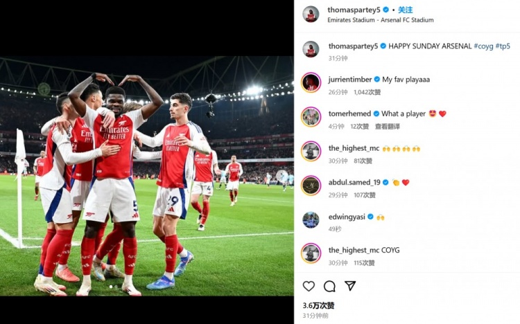 战神比心!托马斯社媒晒庆祝照:枪手们周日快乐! 2月3日讯 阿森纳在本轮英超主场5-1痛击曼城,托马斯在被扳平后闪电破门,帮助球队再次超出比分。第56分钟,福登后场传球被托马斯抢断,托马斯推进到弧顶外一脚爆射,皮球击中斯通斯变向入网。托马斯也晒出自 2025/02/03