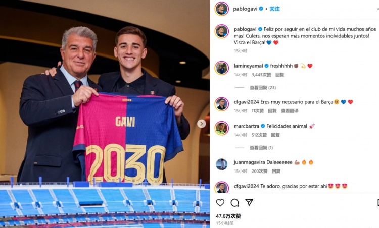 续约至2030!加维晒和拉波尔塔合照:很高兴能留在我最爱的俱乐部 2月1日讯 巴萨在昨日官宣续约加维至2030年,后者也通过社媒晒照纪念。加维晒出自己和巴萨主席拉波尔塔一起手持印有2030字样的巴萨球衣,并配文:“很高兴能够在我生命中最爱的俱乐部继续效力很多年!巴萨 2025/02/01