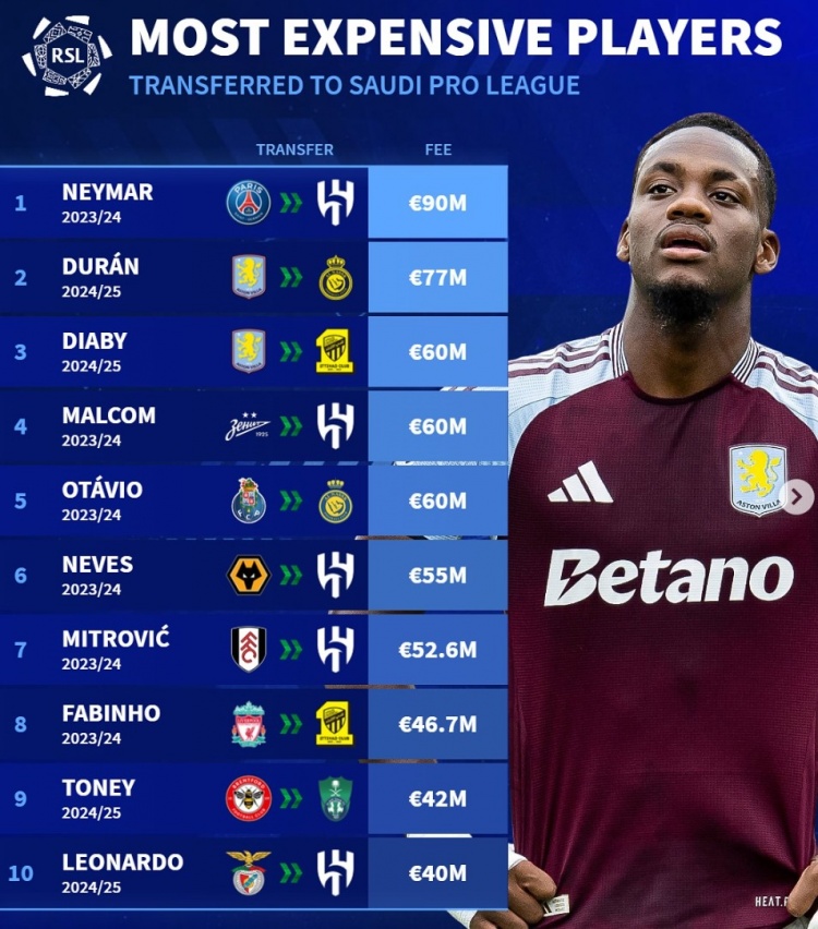 德转列沙特超历史引援榜:内马尔9000万欧居首,杜兰7700万欧第二 2月1日讯 利雅得胜利已经官宣签下维拉前锋杜兰,数据统计显示他也是沙特超历史第二贵引援。德转列沙特超历史引援榜:欧元1.内马尔,巴黎→利雅得新月,23-24赛季,9000万2.杜兰,维拉→利雅得胜利, 2025/02/01