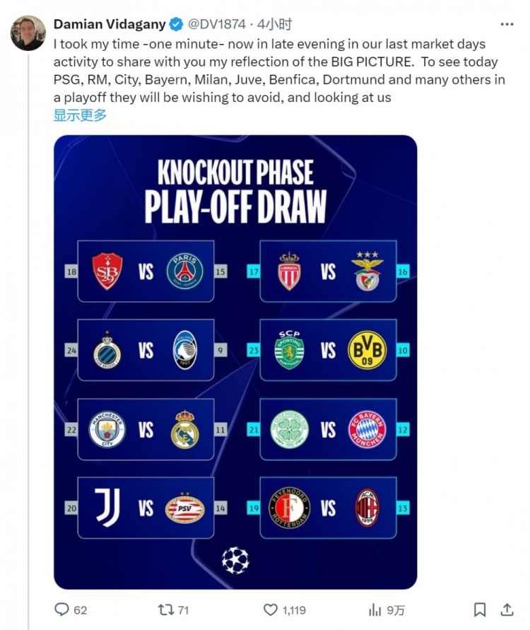 球迷社媒留言要求维拉总监引援,后者回复:相信过程 2月1日讯 维拉体育总监维达加尼在社交媒体上发文,称赞球队在欧冠中的成绩,并对球迷进行了回复。维达加尼晒出欧冠附加赛的对阵表,并写道:“在冬窗尾声阶段的晚上,我花一分钟的时间与大家分享我对整体情况的看 2025/02/01