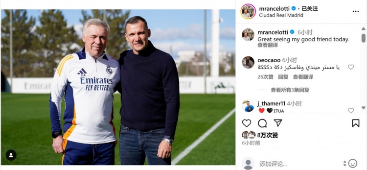 昔日师徒!安切洛蒂社媒晒与舍甫琴科合照:很高兴与朋友相见 1月31日讯 乌克兰传奇球星舍甫琴科今日来到皇马训练基地探班,并与恩师安切洛蒂亲切交谈。安切洛蒂也在个人社媒晒出与舍甫琴科的合照,配文写道:“很高兴今天与我的好友相聚!” 2025/01/31